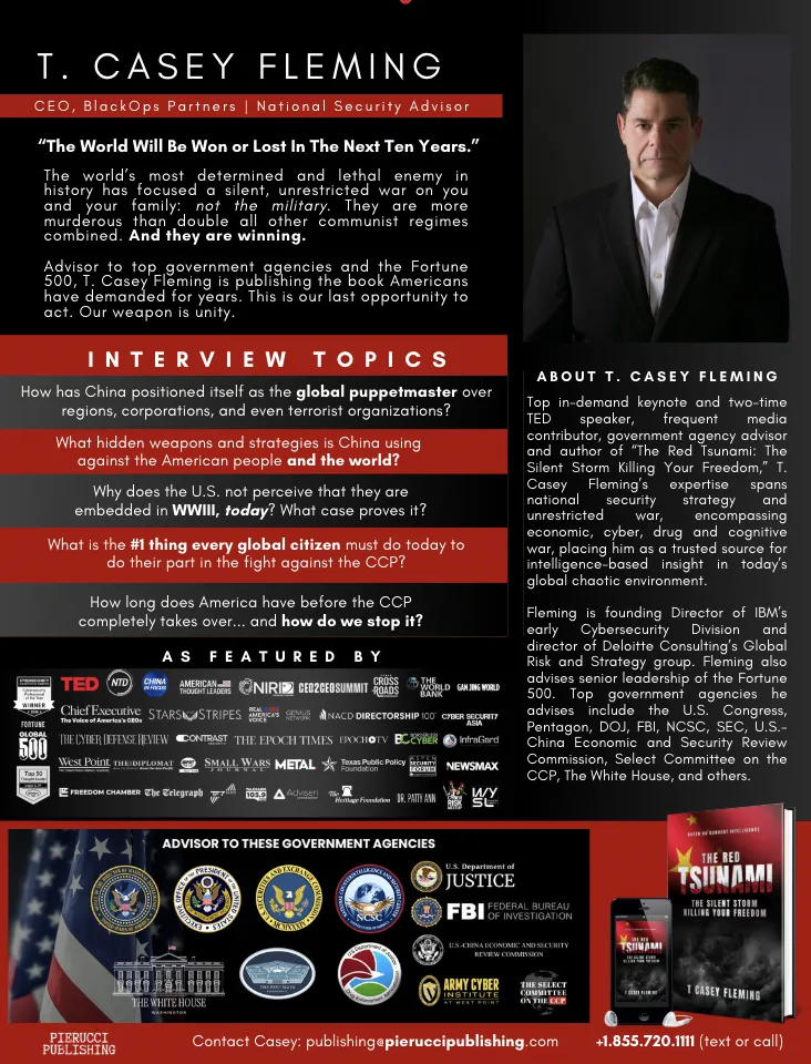 Top in-demand keynote and two-time TED speaker, frequent media contributor, government agency advisor and author of “The Red Tsunami: The Silent Storm Killing Your Freedom,” T. Casey Fleming’s expertise spans national security strategy and unrestricted war, encompassing economic, cyber, drug and cognitive war, placing him as a trusted source for intelligence-based insight in today’s global chaotic environment.